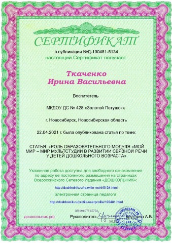 На страницах Всероссийского Сетевого издания «Дошкольник» статья «Роль образовательного модуля «Мой мир-Мир мультипликации в развитии связной речи у детей дошкольного возраста» Свидетельство о публикации №Д-100481-5134-22.04.2021г.